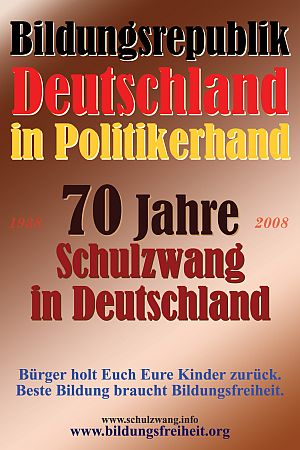 Als am 6. Juli 1938 die nationalsozialistische Führung unter Adolf Hitler und Reichsminister Dr. Rust in Berchtesgaden das Reichsschulpflichtgesetz unterzeichnete, konnte sie nicht ahnen, dass die wesentlichen Bestandteile dieses Gesetzes auch 70 Jahre danach noch ihre Gültigkeit haben würden. Mit dem Untergang des vermeintlich „tausendjährigen Reiches“ verschwanden zwar die meisten Gesetze und Verordnungen aus jener Zeit, der europaweit einmalige deutsche Schulzwang, der es dem Staat ermöglicht, Schüler mit Hilfe der Polizei und notfalls unter Einsatz von Gewalt der Schule zuzuführen, blieb unverändert. Die Schulgesetze der meisten Bundesländer übernahmen den Paragraphen fast wörtlich in ihre Gesetzgebung.
